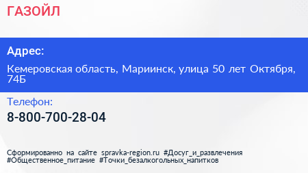 ГАЗОЙЛ по адресу Кемеровская область, Мариинск, улица 50 лет Октября, 74Б в дальнейшем Организация, размещена в следующих категориях: