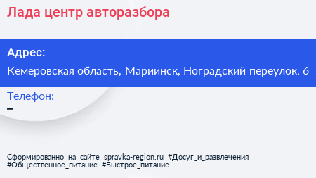 Лада, центр авторазбора по адресу Кемеровская область, Мариинск, Ноградский переулок, 6 в дальнейшем Организация, размещена в следующих категориях: