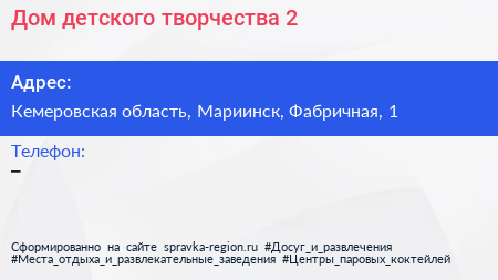 Дом детского творчества №2 по адресу Кемеровская область, Мариинск, Фабричная, 1 в дальнейшем Организация, размещена в следующих категориях: