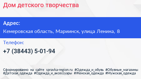 Дом детского творчества по адресу Кемеровская область, Мариинск, улица Ленина, 8 в дальнейшем Организация, размещена в следующих категориях: