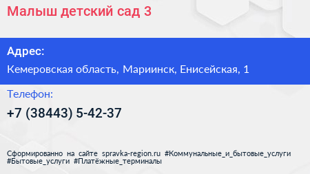 Малыш, детский сад №3 по адресу Кемеровская область, Мариинск, Енисейская, 1 в дальнейшем Организация, размещена в следующих категориях:
