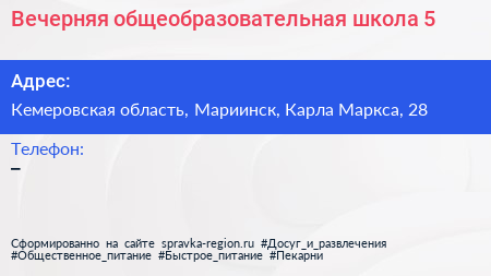 Вечерняя общеобразовательная школа №5 по адресу Кемеровская область, Мариинск, Карла Маркса, 28 в дальнейшем Организация, размещена в следующих категориях: