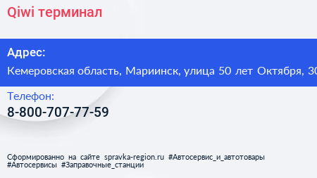 Qiwi, терминал по адресу Кемеровская область, Мариинск, улица 50 лет Октября, 30 в дальнейшем Организация, размещена в следующих категориях: