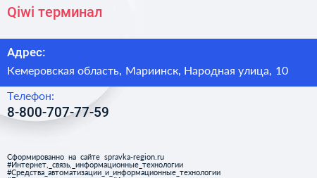 Qiwi, терминал по адресу Кемеровская область, Мариинск, Народная улица, 10 в дальнейшем Организация, размещена в следующих категориях: