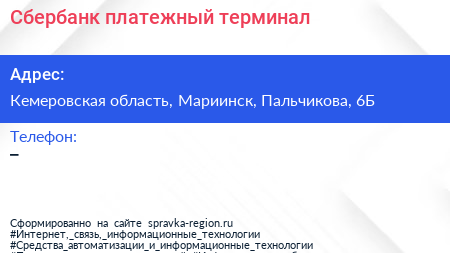 Сбербанк, платежный терминал по адресу Кемеровская область, Мариинск, Пальчикова, 6Б в дальнейшем Организация, размещена в следующих категориях: