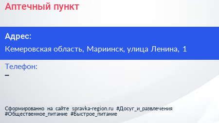 Аптечный пункт по адресу Кемеровская область, Мариинск, улица Ленина, 1 в дальнейшем Организация, размещена в следующих категориях:
