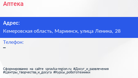 Аптека по адресу Кемеровская область, Мариинск, улица Ленина, 28 в дальнейшем Организация, размещена в следующих категориях:
