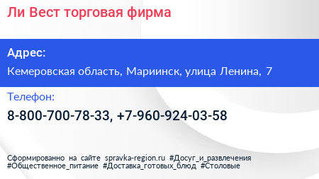 Ли Вест, торговая фирма по адресу Кемеровская область, Мариинск, улица Ленина, 7 в дальнейшем Организация, размещена в следующих категориях: