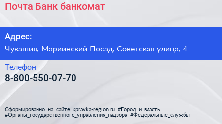 Почта Банк, банкомат по адресу Чувашия, Мариинский Посад, Советская улица, 4 в дальнейшем Организация, размещена в следующих категориях: