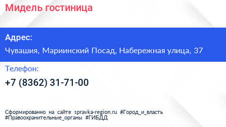 Мидель, гостиница по адресу Чувашия, Мариинский Посад, Набережная улица, 37 в дальнейшем Организация, размещена в следующих категориях: