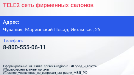 TELE2, сеть фирменных салонов по адресу Чувашия, Мариинский Посад, Июльская, 25 в дальнейшем Организация, размещена в следующих категориях: