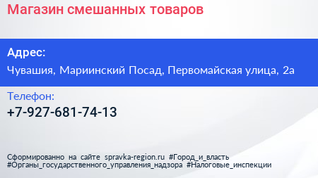 Магазин смешанных товаров по адресу Чувашия, Мариинский Посад, Первомайская улица, 2а в дальнейшем Организация, размещена в следующих категориях: