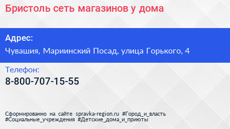 Бристоль, сеть магазинов у дома по адресу Чувашия, Мариинский Посад, улица Горького, 4 в дальнейшем Организация, размещена в следующих категориях: