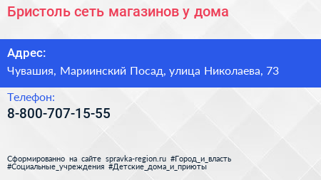 Бристоль, сеть магазинов у дома по адресу Чувашия, Мариинский Посад, улица Николаева, 73 в дальнейшем Организация, размещена в следующих категориях: