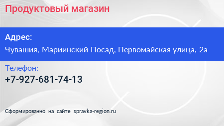 Продуктовый магазин по адресу Чувашия, Мариинский Посад, Первомайская улица, 2а в дальнейшем Организация, размещена в следующих категориях: