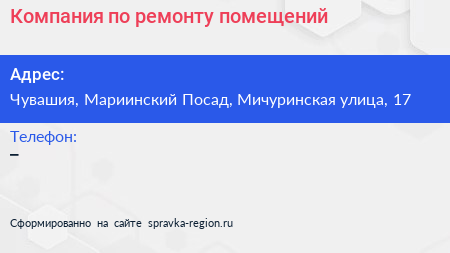 Компания по ремонту помещений по адресу Чувашия, Мариинский Посад, Мичуринская улица, 17 в дальнейшем Организация, размещена в следующих категориях: