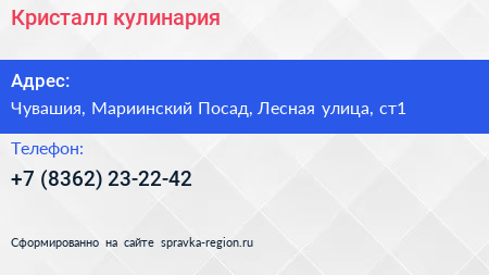 Кристалл, кулинария по адресу Чувашия, Мариинский Посад, Лесная улица, ст1 в дальнейшем Организация, размещена в следующих категориях: