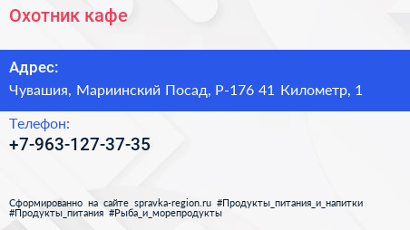 Охотник, кафе по адресу Чувашия, Мариинский Посад, Р-176 41 Километр, 1 в дальнейшем Организация, размещена в следующих категориях: