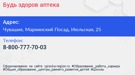 Будь здоров, аптека по адресу Чувашия, Мариинский Посад, Июльская, 25 в дальнейшем Организация, размещена в следующих категориях: