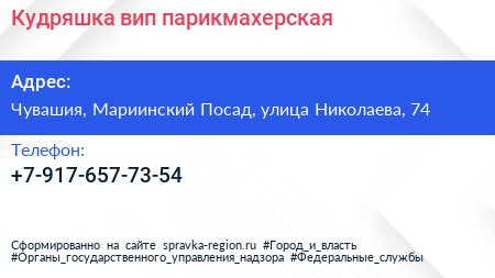 Кудряшка, вип-парикмахерская по адресу Чувашия, Мариинский Посад, улица Николаева, 74 в дальнейшем Организация, размещена в следующих категориях: