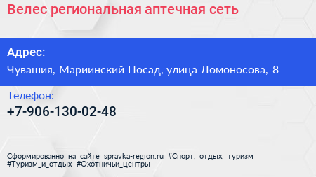 Велес, региональная аптечная сеть по адресу Чувашия, Мариинский Посад, улица Ломоносова, 8 в дальнейшем Организация, размещена в следующих категориях:
