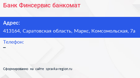 Банк Финсервис, банкомат по адресу 413164, Саратовская область, Маркс, Комсомольская, 7а в дальнейшем Организация, размещена в следующих категориях: