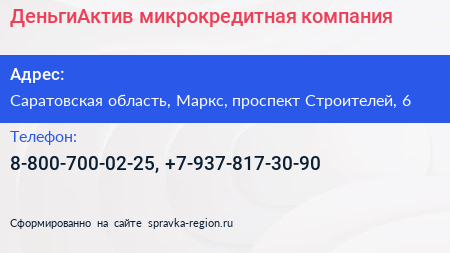 ДеньгиАктив, микрокредитная компания по адресу Саратовская область, Маркс, проспект Строителей, 6 в дальнейшем Организация, размещена в следующих категориях: