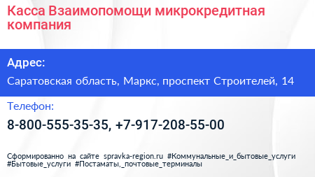 Касса Взаимопомощи, микрокредитная компания по адресу Саратовская область, Маркс, проспект Строителей, 14 в дальнейшем Организация, размещена в следующих категориях: