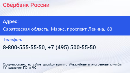 Сбербанк России по адресу Саратовская область, Маркс, проспект Ленина, 68 в дальнейшем Организация, размещена в следующих категориях: