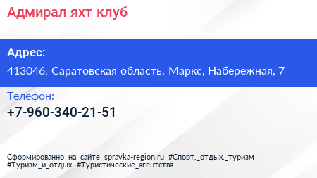 Адмирал, яхт-клуб по адресу 413046, Саратовская область, Маркс, Набережная, 7 в дальнейшем Организация, размещена в следующих категориях: