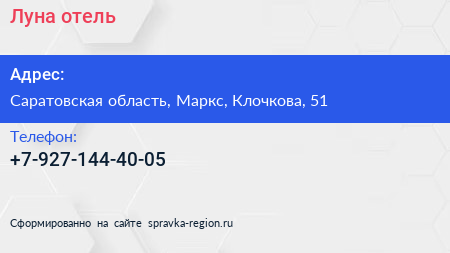 Луна, отель по адресу Саратовская область, Маркс, Клочкова, 51 в дальнейшем Организация, размещена в следующих категориях: