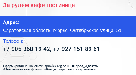 За рулем, кафе-гостиница по адресу Саратовская область, Маркс, Октябрьская улица, 5а в дальнейшем Организация, размещена в следующих категориях: