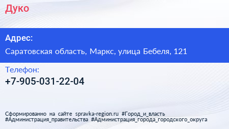 Дуко по адресу Саратовская область, Маркс, улица Бебеля, 121 в дальнейшем Организация, размещена в следующих категориях: