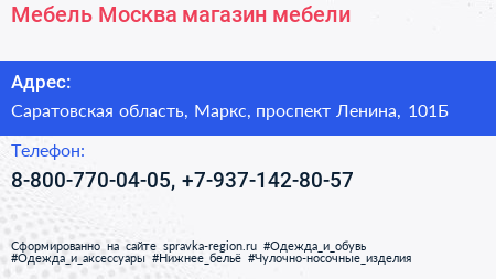 Мебель Москва, магазин мебели по адресу Саратовская область, Маркс, проспект Ленина, 101Б в дальнейшем Организация, размещена в следующих категориях: