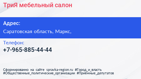 ТриЯ, мебельный салон по адресу Саратовская область, Маркс, в дальнейшем Организация, размещена в следующих категориях: