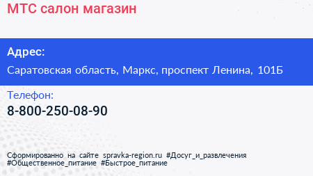 МТС, салон-магазин по адресу Саратовская область, Маркс, проспект Ленина, 101Б в дальнейшем Организация, размещена в следующих категориях: