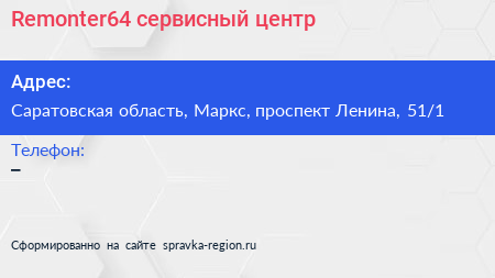 Remonter64, сервисный центр по адресу Саратовская область, Маркс, проспект Ленина, 51/1 в дальнейшем Организация, размещена в следующих категориях: