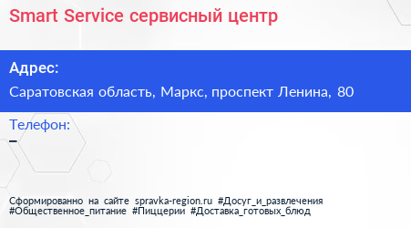 Smart Service, сервисный центр по адресу Саратовская область, Маркс, проспект Ленина, 80 в дальнейшем Организация, размещена в следующих категориях: