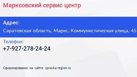Марксовский сервис-центр по адресу Саратовская область, Маркс, Коммунистическая улица, 45 в дальнейшем Организация, размещена в следующих категориях: