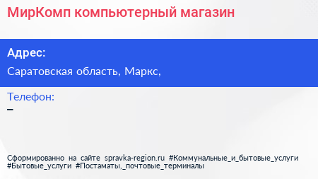 МирКомп, компьютерный магазин по адресу Саратовская область, Маркс, в дальнейшем Организация, размещена в следующих категориях: