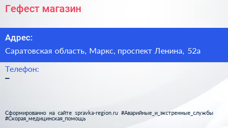 Гефест, магазин по адресу Саратовская область, Маркс, проспект Ленина, 52а в дальнейшем Организация, размещена в следующих категориях: