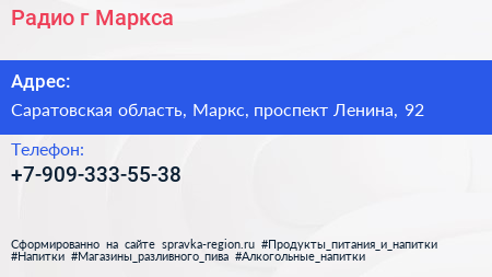 Радио г. Маркса по адресу Саратовская область, Маркс, проспект Ленина, 92 в дальнейшем Организация, размещена в следующих категориях: