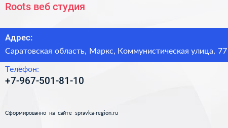 Roots, веб-студия по адресу Саратовская область, Маркс, Коммунистическая улица, 77 в дальнейшем Организация, размещена в следующих категориях: