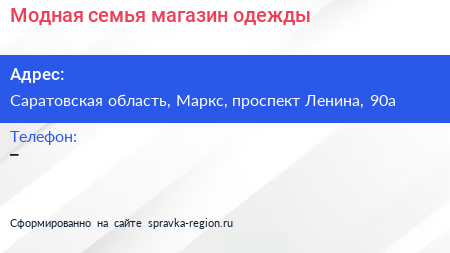 Модная семья, магазин одежды по адресу Саратовская область, Маркс, проспект Ленина, 90а в дальнейшем Организация, размещена в следующих категориях: