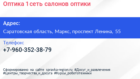 Оптика №1, сеть салонов оптики по адресу Саратовская область, Маркс, проспект Ленина, 55 в дальнейшем Организация, размещена в следующих категориях:
