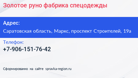Золотое руно, фабрика спецодежды по адресу Саратовская область, Маркс, проспект Строителей, 19а в дальнейшем Организация, размещена в следующих категориях: