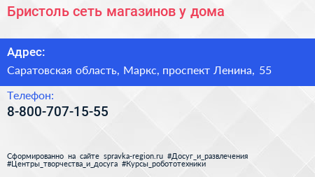 Бристоль, сеть магазинов у дома по адресу Саратовская область, Маркс, проспект Ленина, 55 в дальнейшем Организация, размещена в следующих категориях: