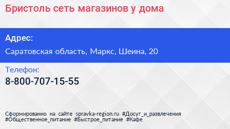 Бристоль, сеть магазинов у дома по адресу Саратовская область, Маркс, Шеина, 20 в дальнейшем Организация, размещена в следующих категориях: