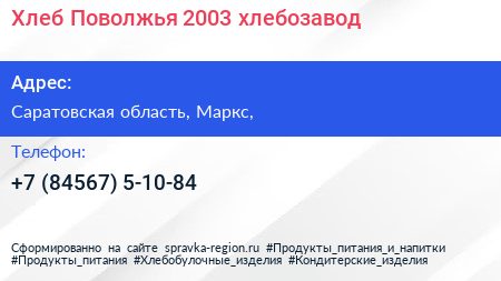 Хлеб-Поволжья 2003, хлебозавод по адресу Саратовская область, Маркс, в дальнейшем Организация, размещена в следующих категориях: