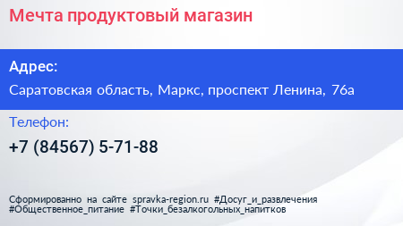 Мечта, продуктовый магазин по адресу Саратовская область, Маркс, проспект Ленина, 76а в дальнейшем Организация, размещена в следующих категориях: